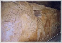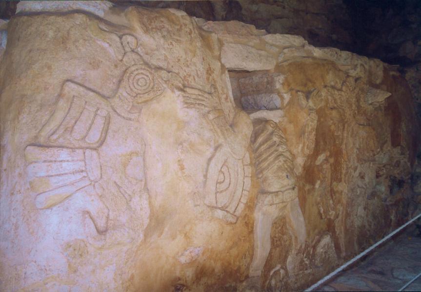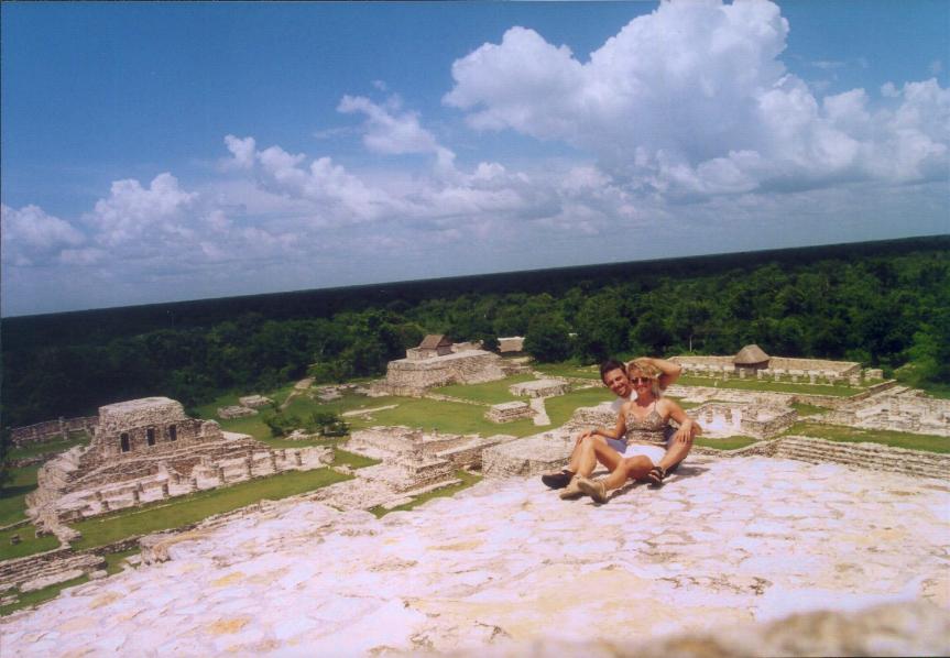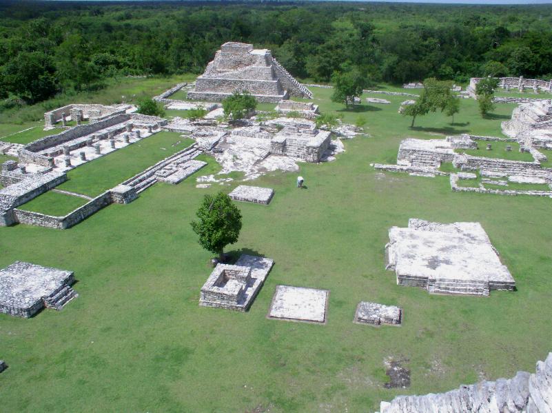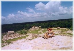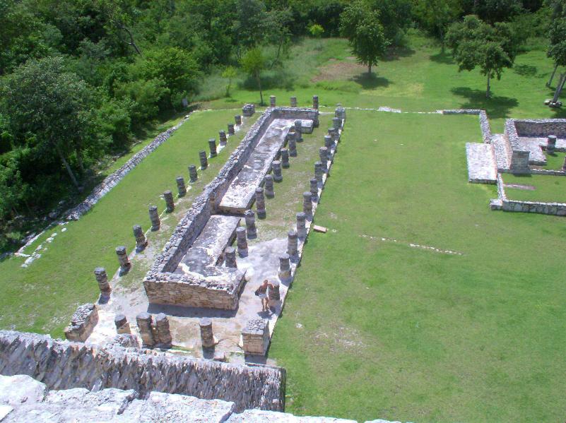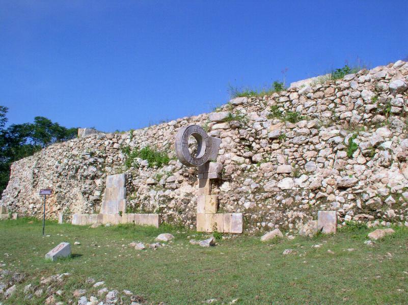 Un po’ accaldati finalmente arriviamo al sito di Mayapan, l’ultima grande città Maya del XIII sec. Siamo l’unica macchina presente nel parcheggio. Paghiamo 24 MX$ (2 eur) a testa ed andiamo in esplorazione. Il sito è oltre le nostre aspettative: l’area archeologica è molto curata e presenta alcuni affreschi ancora intatti. Saliamo sulla grande piramide parzialmente restaurata. Non è altissima ma molto ripida ( ...e noi dobbiamo fare training per Chichen Itza, che ci hanno detto essere da vertigini!). Da sopra la piramide si gode una bellissima vista, ci siamo solo noi e qualche giardiniere che fa manutenzione del prato erboso! Una volta scesi vediamo un ammasso di pietre numerate; sembra pazzesco che questa pietraia possa essere stata analizzata e classificata da poter risalire esattamente all’ubicazione originale di ogni singola pietra!