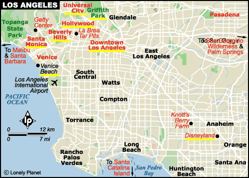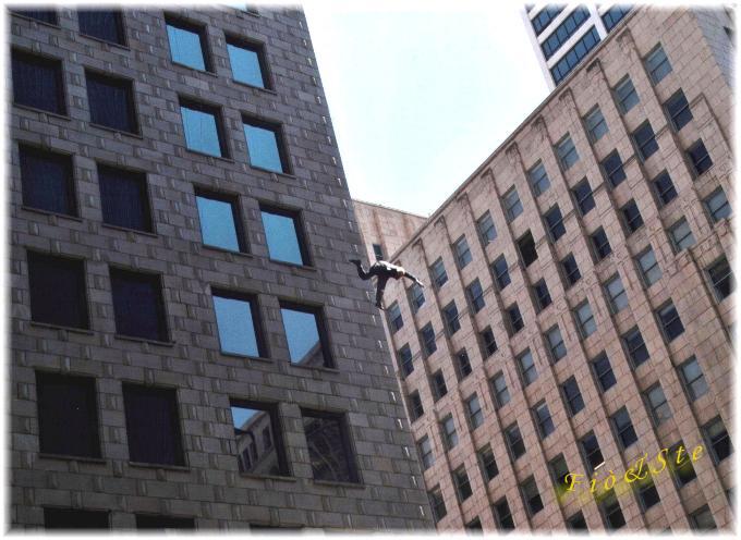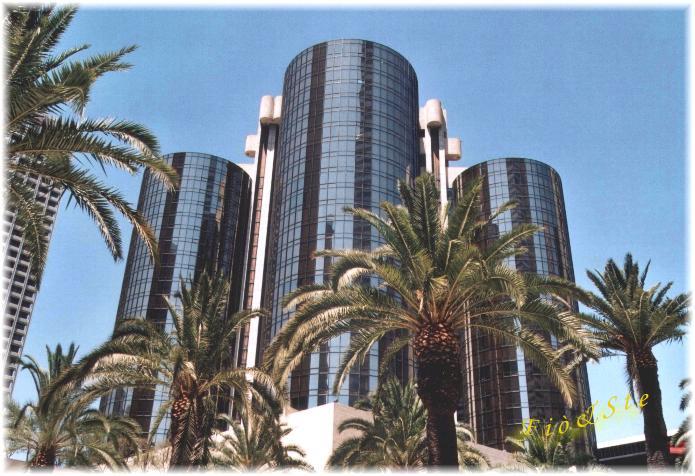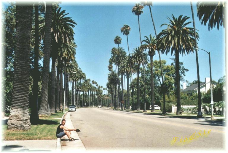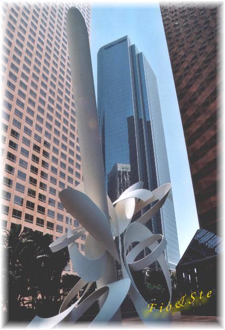 Dom. 17 ago: oggi si girovaga per la città. Si passa per la semi deserta Beverly Hills e Rodeo Drive (peccato, tutti i negozi sono chiusi, mi sentivo in vena di shopping...) e poi si va a fare un giro alla City a vedere qualche grattacielo. Qui è ancora più deserto visto che è domenica e soprattutto che trattasi prevalentemente di uffici. Ci imbattiamo però nel terzo set di film (ieri ne avevamo visti due a Hollywood) e fotografiamo la scena clou, cioè un distinto signore vestito in completo grigio con cravatta che si butta da un grattacielo... ovviamente sorretto da una corda ma il tutto è molto realistico! Ci dicono che è un telefilm di avvocati. Peccato non servano comparse, eravamo ben disponibili! Nel primo pomeriggio andiamo a rinforzare la nostra abbronzatura a S. Monica... Ecco dove sono tutti!! A fatica parcheggiamo, si vede che è domenica! Dopo un giretto riprendiamo la macchina e scendiamo a Venice Beach. Qui il casino è uguale, ma il posto è pittoresco con tutti i negozietti, gli artisti di strada, i localini... vi assicuro che domani qui sarà un mortorio con kilometri di spiaggia semi deserta! Restiamo un po’ a prendere il sole e proviamo a fare un bagno, ma l’acqua oceanica è gelida e non ci resta che saltare le onde in punta di piedi. Torniamo per cena con la voglia di mangiare giapponese. Lo Ste aveva già puntato un locale quando eravamo stati all’Universal City. Il posto era a buffet e chiudeva alle nove. Noi facciamo i bravi italiani ed arriviamo praticamente all’orario di chiusura; ci dicono di sbrigarci a scegliere tra le varie pietanze prima che riportino tutto in cucina… e non avendo afferrato bene la cosa in quanto continuavamo a vagare tra una portata e l’altra indecisi, quando siamo tornati al tavolo avevano ben pensato loro di metterci da parte altre pietanze calde. Risultato: 2 tavoli pieni di piatti, tra cui aragoste e altri pesci squisiti di vario tipo (dato che eravamo gli ultimi avevano svuotato le pentole) sushi, tempura, macedonia, omelette dolci panna e fragole, pasticcini vari!! Burp...